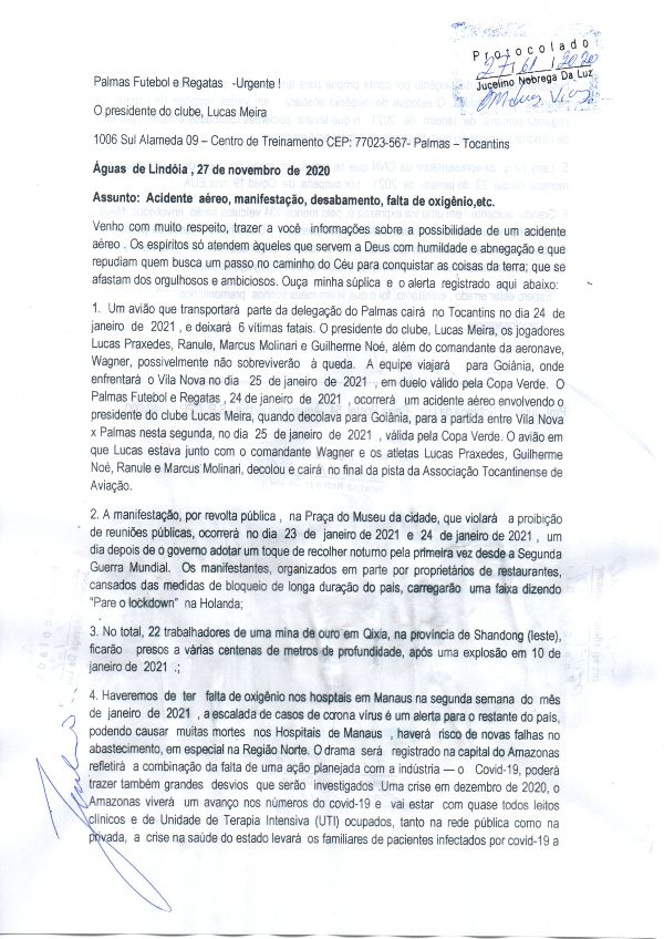 Quatro atletas e o presidente do Palmas cujo uma carta foi enviada através dos correios em 27 de novembro de 2021 – infelizmente , poderá morrer na tragédia. . O avião particular caiu após a decolagem, em Porto Nacional (TO). O piloto da aeronave também poderá morrer na hora.