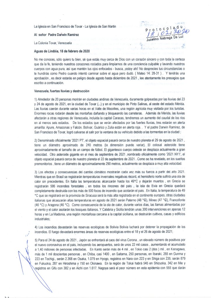 Писмо за 2020 г. – изпратено до отец Давин Рамирес от Сан Франциско де Товар – Венецуела – превод по -долу