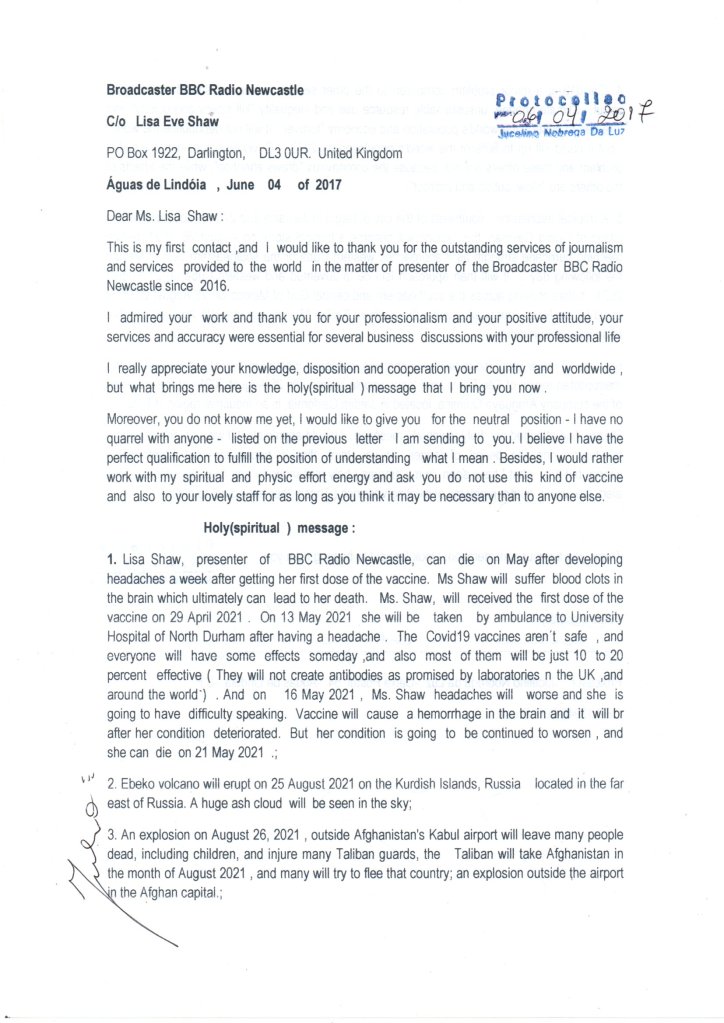 Jucelino Luz wrote her two letters , one in 2017 and another in 2021 , and told “Lisa died due to complications of a Covid vaccination.” It is very sad that .