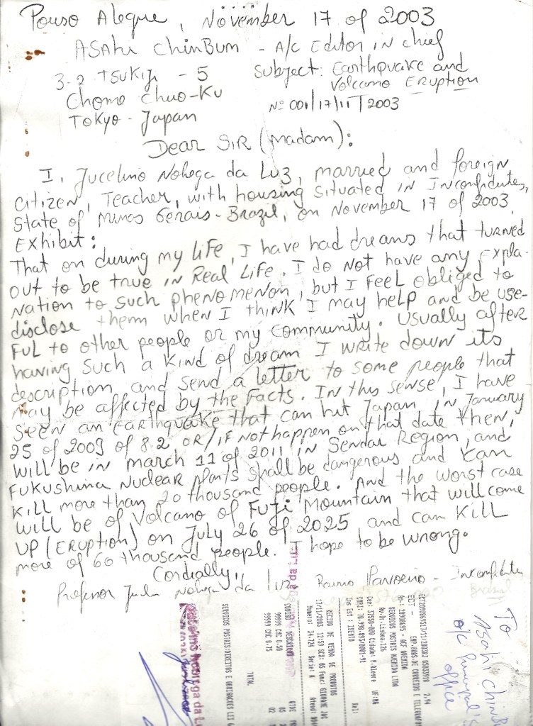 2011年3月11日14時57分に発生したマグニチュード9.0の東北地方太平洋沖地震では、10メートルを超える巨大な津波が発生し、約3,000万人の犠牲者を出したほか、福島原子力発電所の原子炉が破壊されるなど多くの被害をもたらしました。今回の地震は、日本での観測史上最大のものです。そのドキュメンタリーを以下に紹介します。それを予言したのがジュセリーノ・ルスで、彼は日本の当局に警告の手紙を送りました。