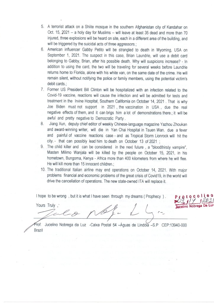 Jucelino Nóbrega da Luz, É escritor, ambientalista , orientador espiritual, visionário de grande credibilidade no mundo , apresentado em alguns meios de comunicação de massa no Brasil , Hong Kong , Japão, França , EUA , como um profeta que pode fazer previsões por meio de sonhos (sonhos lúcidos). Nasceu em Floriano, Maringá, Estado do Paraná. Brasil .Considerado um profeta da era moderna, orientador espiritual . .Tem um trabalho em favor da humanidade , proteção ambiental e da preservação do planeta . ジュセリーノノブレガダルス、 彼は作家、環境保護主義者、精神的顧問であり、世界で大きな信頼を築く先見の明を持っており、夢(明晰夢)を通して予測を行うことができる預言者として、ブラジル、香港、日本、フランス、米国のいくつかのマスメディアで紹介されています。 パラナ州マリンガのフロリアーノに生まれる。 ブラジル。現代の預言者、スピリチュアルガイドと見なされます。 。人類、環境保護、地球の保全に有利な働きをしています。 Jucelino Nóbrega da Luz, He is a writer, environmentalist, spiritual advisor, visionary of great credibility in the world, presented in some mass media in Brazil, Hong Kong, Japan, France, USA, as a prophet who can make predictions through dreams (lucid dreams) . Born in Floriano, Maringá, State of Paraná. Brazil. Considered a prophet of the modern era, spiritual guide. He has a job in favor of humanity, environmental protection and the preservation of the planet. Жуселино Нобрега да Луз, Он писатель, защитник окружающей среды, духовный наставник, провидец, пользующийся большим доверием в мире, представленный в некоторых средствах массовой информации в Бразилии, Гонконге, Японии, Франции, США как пророк, который может делать предсказания через сны (осознанные сны). Родился в Флориано, Маринга, штат Парана. Бразилия Считается пророком современной эпохи, духовным наставником. .Он работает на благо человечества, защиты окружающей среды и сохранения планеты. Jucelino Nóbrega da Luz, 그는 작가, 환경 운동가, 영적 고문, 세계에서 위대한 신뢰의 비전가이며, 꿈 (자각몽)을 통해 예언을 할 수있는 예언자로 브라질, 홍콩, 일본, 프랑스, ​​미국의 일부 대중 매체에 발표되었습니다. 파라나 주 마링가의 플로리 아노 출생. 브라질 : 현대 시대의 선지자, 영적 인도자로 간주됩니다. . 인류, 환경 보호 및 지구 보존을 위해 일하고 있습니다. Jucelino Nóbrega da Luz, C'est un écrivain, environnementaliste, conseiller spirituel, visionnaire d'une grande crédibilité dans le monde, présenté dans certains médias de masse au Brésil, Hong Kong, Japon, France, USA, comme un prophète capable de faire des prédictions à travers les rêves (rêves lucides). Né à Floriano, Maringá, État du Paraná. Brésil, considéré comme un prophète de l'ère moderne, guide spirituel. .Ouvre en faveur de l'humanité, de la protection de l'environnement et de la préservation de la planète. JucelinoNóbregada Luz, 他是一位作家,环境保护主义者,精神顾问,具有远见卓识的世界,曾在巴西,香港,日本,法国,美国的一些大众媒体上作过演讲,他是先知,可以通过梦(清醒的梦)做出预测。 出生于巴拉那州马林加的弗洛里亚诺。 巴西:被视为现代的先知,属灵向导。 致力于人类,环境保护和地球的保护。 Jucelino Nóbrega da Luz, Es escritor, ambientalista, asesor espiritual, visionario de gran credibilidad en el mundo, presentado en algunos medios de comunicación de Brasil, Hong Kong, Japón, Francia, Estados Unidos, como un profeta que puede hacer predicciones a través de los sueños (sueños lúcidos). Nacido en Floriano, Maringá, Estado de Paraná. Brasil Considerado profeta de la era moderna, guía espiritual. .Ha trabajado a favor de la humanidad, la protección del medio ambiente y la preservación del planeta. जुसेलिनो नोब्रेगा दा लूज़, वह एक लेखक, पर्यावरणविद्, आध्यात्मिक सलाहकार, दुनिया में महान विश्वसनीयता के दूरदर्शी, ब्राजील, हांगकांग, जापान, फ्रांस, संयुक्त राज्य अमेरिका में कुछ बड़े पैमाने पर मीडिया में प्रस्तुत किए गए एक पैगंबर हैं जो सपनों के माध्यम से भविष्यवाणियां कर सकते हैं (आकर्षक सपने)। फ्लोरानो, मारिंगा, पराना राज्य में जन्मे। ब्राजील। आधुनिक युग, आध्यात्मिक मार्गदर्शक का पैगंबर माना जाता है। .हास मानवता, पर्यावरण संरक्षण और ग्रह के संरक्षण के पक्ष में काम करता है। Jucelino Nóbrega da Luz, È scrittore, ambientalista, consigliere spirituale, visionario di grande credibilità nel mondo, presentato in alcuni mass media in Brasile, Hong Kong, Giappone, Francia, USA, come un profeta che può fare previsioni attraverso i sogni 