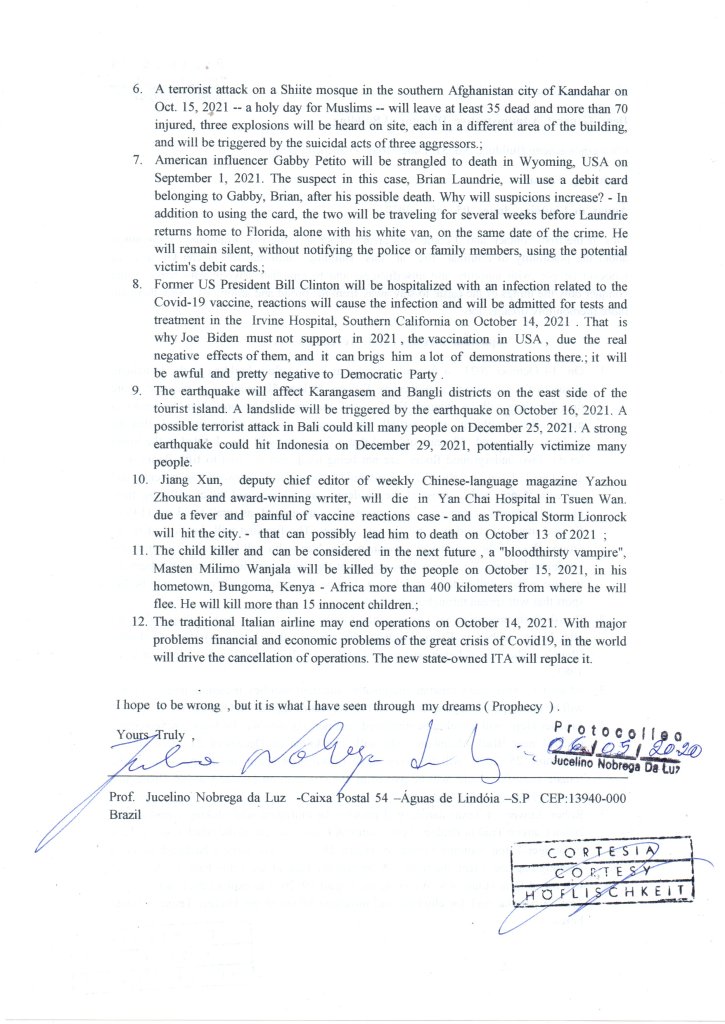Jucelino Nóbrega da Luz, É escritor, ambientalista , orientador espiritual, visionário de grande credibilidade no mundo , apresentado em alguns meios de comunicação de massa no Brasil , Hong Kong , Japão, França , EUA , como um profeta que pode fazer previsões por meio de sonhos (sonhos lúcidos). Nasceu em Floriano, Maringá, Estado do Paraná. Brasil .Considerado um profeta da era moderna, orientador espiritual . .Tem um trabalho em favor da humanidade , proteção ambiental e da preservação do planeta . ジュセリーノノブレガダルス、 彼は作家、環境保護主義者、精神的顧問であり、世界で大きな信頼を築く先見の明を持っており、夢(明晰夢)を通して予測を行うことができる預言者として、ブラジル、香港、日本、フランス、米国のいくつかのマスメディアで紹介されています。 パラナ州マリンガのフロリアーノに生まれる。 ブラジル。現代の預言者、スピリチュアルガイドと見なされます。 。人類、環境保護、地球の保全に有利な働きをしています。 Jucelino Nóbrega da Luz, He is a writer, environmentalist, spiritual advisor, visionary of great credibility in the world, presented in some mass media in Brazil, Hong Kong, Japan, France, USA, as a prophet who can make predictions through dreams (lucid dreams) . Born in Floriano, Maringá, State of Paraná. Brazil. Considered a prophet of the modern era, spiritual guide. He has a job in favor of humanity, environmental protection and the preservation of the planet. Жуселино Нобрега да Луз, Он писатель, защитник окружающей среды, духовный наставник, провидец, пользующийся большим доверием в мире, представленный в некоторых средствах массовой информации в Бразилии, Гонконге, Японии, Франции, США как пророк, который может делать предсказания через сны (осознанные сны). Родился в Флориано, Маринга, штат Парана. Бразилия Считается пророком современной эпохи, духовным наставником. .Он работает на благо человечества, защиты окружающей среды и сохранения планеты. Jucelino Nóbrega da Luz, 그는 작가, 환경 운동가, 영적 고문, 세계에서 위대한 신뢰의 비전가이며, 꿈 (자각몽)을 통해 예언을 할 수있는 예언자로 브라질, 홍콩, 일본, 프랑스, ​​미국의 일부 대중 매체에 발표되었습니다. 파라나 주 마링가의 플로리 아노 출생. 브라질 : 현대 시대의 선지자, 영적 인도자로 간주됩니다. . 인류, 환경 보호 및 지구 보존을 위해 일하고 있습니다. Jucelino Nóbrega da Luz, C'est un écrivain, environnementaliste, conseiller spirituel, visionnaire d'une grande crédibilité dans le monde, présenté dans certains médias de masse au Brésil, Hong Kong, Japon, France, USA, comme un prophète capable de faire des prédictions à travers les rêves (rêves lucides). Né à Floriano, Maringá, État du Paraná. Brésil, considéré comme un prophète de l'ère moderne, guide spirituel. .Ouvre en faveur de l'humanité, de la protection de l'environnement et de la préservation de la planète. JucelinoNóbregada Luz, 他是一位作家,环境保护主义者,精神顾问,具有远见卓识的世界,曾在巴西,香港,日本,法国,美国的一些大众媒体上作过演讲,他是先知,可以通过梦(清醒的梦)做出预测。 出生于巴拉那州马林加的弗洛里亚诺。 巴西:被视为现代的先知,属灵向导。 致力于人类,环境保护和地球的保护。 Jucelino Nóbrega da Luz, Es escritor, ambientalista, asesor espiritual, visionario de gran credibilidad en el mundo, presentado en algunos medios de comunicación de Brasil, Hong Kong, Japón, Francia, Estados Unidos, como un profeta que puede hacer predicciones a través de los sueños (sueños lúcidos). Nacido en Floriano, Maringá, Estado de Paraná. Brasil Considerado profeta de la era moderna, guía espiritual. .Ha trabajado a favor de la humanidad, la protección del medio ambiente y la preservación del planeta. जुसेलिनो नोब्रेगा दा लूज़, वह एक लेखक, पर्यावरणविद्, आध्यात्मिक सलाहकार, दुनिया में महान विश्वसनीयता के दूरदर्शी, ब्राजील, हांगकांग, जापान, फ्रांस, संयुक्त राज्य अमेरिका में कुछ बड़े पैमाने पर मीडिया में प्रस्तुत किए गए एक पैगंबर हैं जो सपनों के माध्यम से भविष्यवाणियां कर सकते हैं (आकर्षक सपने)। फ्लोरानो, मारिंगा, पराना राज्य में जन्मे। ब्राजील। आधुनिक युग, आध्यात्मिक मार्गदर्शक का पैगंबर माना जाता है। .हास मानवता, पर्यावरण संरक्षण और ग्रह के संरक्षण के पक्ष में काम करता है। Jucelino Nóbrega da Luz, È scrittore, ambientalista, consigliere spirituale, visionario di grande credibilità nel mondo, presentato in alcuni mass media in Brasile, Hong Kong, Giappone, Francia, USA, come un profeta che può fare previsioni attraverso i sogni 