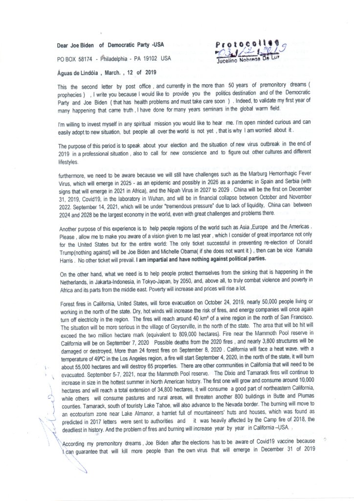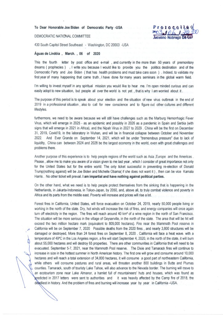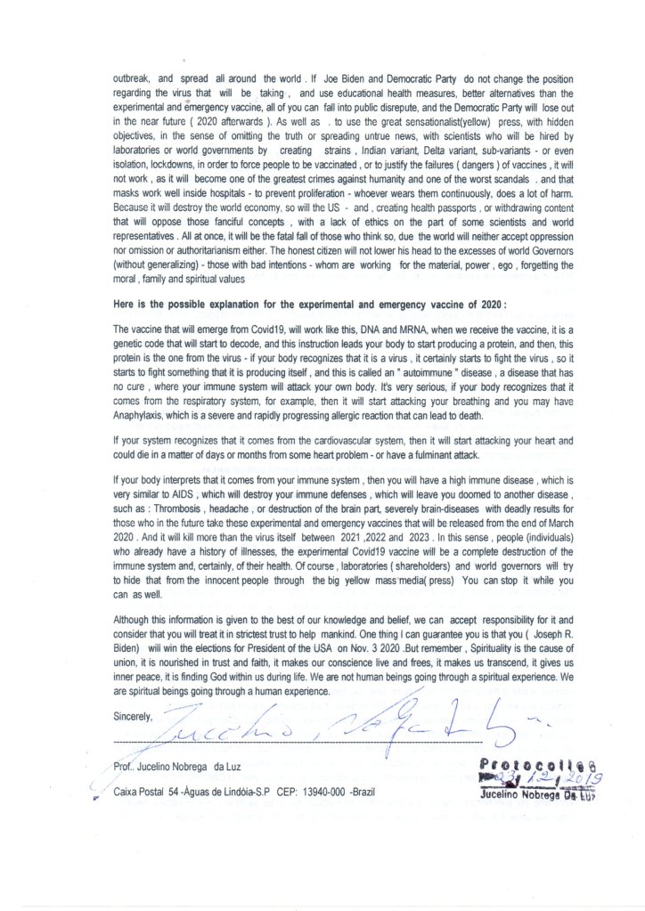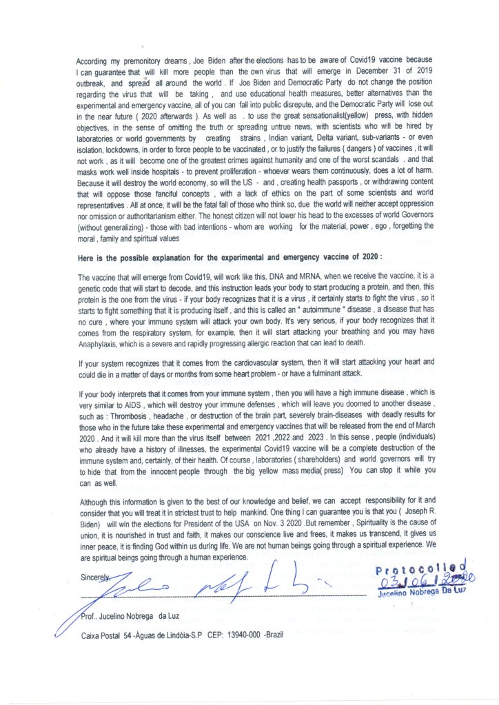 We make sure that no event we organise can appear as a direct or indirect activity that favours a political party or any other influential group (ideological, religious, etc.). No politician is going to stand up here and say they don’t think vaccination safety is important, that’s political suicide. I sent you the letter below by post and email over a year ago (there are other old ones) when I told Joe Biden & Democratic Party that he would win the election of the United States of America, but I told him to protect the people and not destroy their freedom – I meant that the vaccine is also a danger to the people.