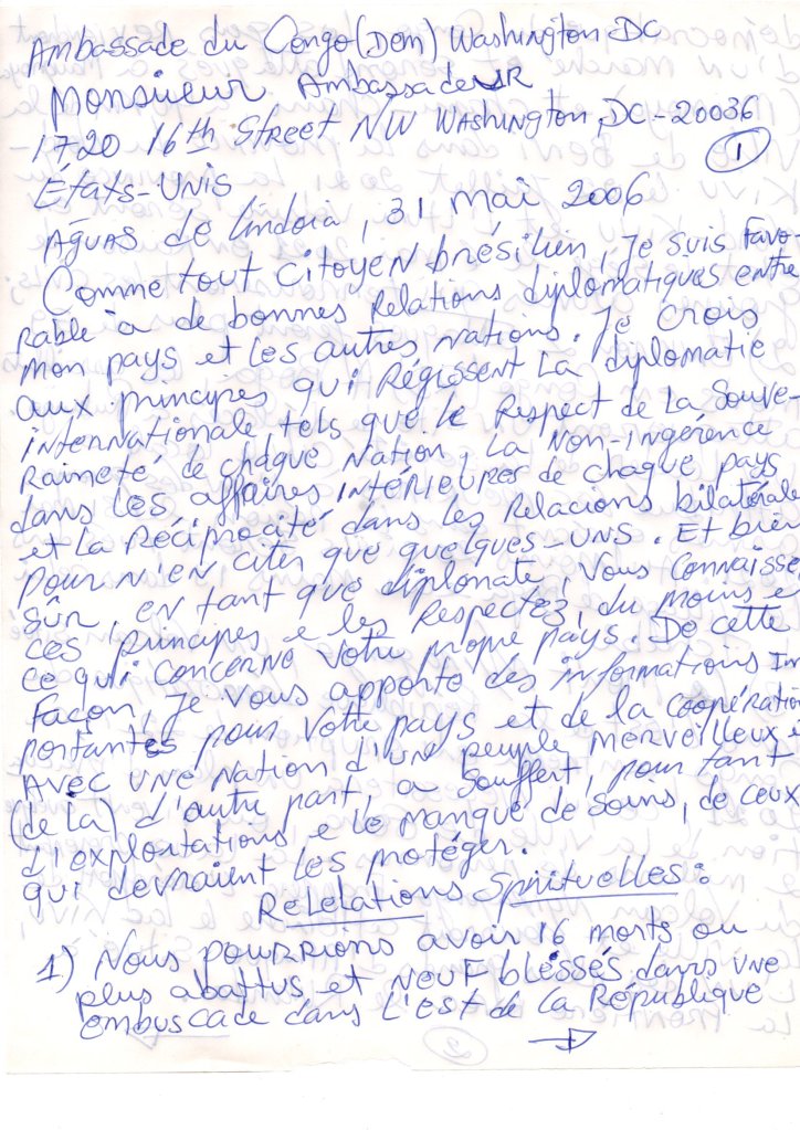Like every Brazilian citizen, I am in favor of good diplomatic relations between my country and other nations. I believe in the principles that govern international diplomacy, such as respect for the sovereignty of each nation, non-interference in the internal affairs of each country, and reciprocity in bilateral relations, just to name a few. And of course you, being a diplomat, know these principles, and uphold them, at least as far as your own country is concerned. So, I bring you some important information for your country, and of cooperation with a nation of wonderful people, and on the other hand, suffering from so many exploitations and lack of care by those who should protect them.