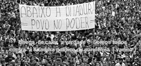 في أبريل 2020 ، حدث انقلاب بقيادة قوى سياسية وسلطات مسيسة واتفاقات مزعومة بين المعامل والهيئات الصحية. بدأ نظام دكتاتورية حرية التعبير والجائحة بعد أيام قليلة من الكرنفال – خلق مراسيم مشبوهة وأنظمة استبدادية واضطهاد الساخطين ، إلخ. . تم إنشاء أعمال مؤسسية عززت عدم احترام الدستور البرازيلي ، وعدم احترام حرية التعبير والفكر ، وأشهرها: ديكتاتورية الوباء والصراعات السياسية – تم إنشاؤها مع ظهور الوباء واللقاح – أيضًا من خلال سياسة الحرب المعلنة ، ألغت جميع عناصر دستور الدستور الاتحادي والقانون المدني والجرائم المنصوص عليها في قانون العقوبات ، والتي يمكن استخدامها ضد السلطة القائمة التي تعتبر نفسها وسيطة .. ظهرت عدة إجراءات أخرى ، من بينها إنشاء مجلس أعلى للرقابة (مخفي عن السكان) ، هدفه التحكم في وسائل الإعلام التي لا تتوافق مع القواعد المعمول بها والحكم عليها. (فقط أولئك الذين يعارضون مفاهيم التطعيم أو المتعاطفين مع الحكومة الفيدرالية) Facebook و Youtube و Intagran ، هي بعض هذه الهيئات ، والتي انتهى بها الأمر بإغلاق وسائل الإعلام أمام معارضي مفاهيم مندوبي اللقاحات (المعامل والحكام) ، يشتبه أيضًا في أنه يقودها سياسي معروف ، وهيئات تشريعية ، جزء من السلطة التنفيذية (مجلس الشيوخ) ، يتم تفعيلها من قبل المحاكم الفيدرالية العليا المسيسة ، وأول من يلتزم الصمت ، ويتم تجنيده لأغراض خفية وفردية ، هم صحفيون ، جزء منهم منخرط في وسائل الإعلام المثيرة يستخدمون أداة بمعنى تحديد موقع “الأخبار المزيفة” المزعومة – علاوة على ذلك ، فإن المراقبين هم الذين يرتكبون معظم الجرائم ، ويفرضون الرقابة على الحق الدستوري في حرية التعبير والفكر. غالبًا ما تسيطر ميليشيات الإنترنت على بعض الجماعات الصحفية التي تروج للمعلومات المضللة ، أي أن الغرض منها غامض ومليء بالنوايا الفردية لمجموعة مسيّسة مهيمنة. التحرير والخلق تحت غطاء من الأكاذيب ، كذريعة: “الأخبار الزائفة” – فقط لحجبها – “الصحيح حقًا”.