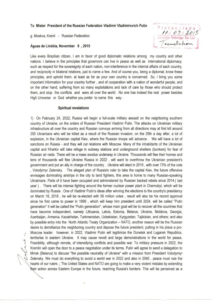 I le tusi na auina atu ia Peresitene Vladimir Putin, i Rusia na ia vavalo ai e uiga i se osofaiga a Ukraine ia Fepuari 24, 2022. Na faalauiloa e le Peresetene Vladimir Putin le osofaʻiga a le militeri i sasaʻe o Ukraine, lea o loʻo i ai vaega vavae ese na ia iloa o loʻo tutoʻatasi. Na vave lava ona manino o le osofaʻiga a le ‘au i le teritori atoa o Ukrainian. O loo i ai se isi tusi faavaloaga na auina atu i le 2014 faapea foi i le 2015 i le Peresitene o Ukraine i lena taimi. I lana tautalaga, na faia ai e le peresitene o Rusia le taufaamatau ma fai mai soo se tasi e taumafai e faʻalavelave o le a mafatia i taunuuga e leʻi vaʻaia muamua.
