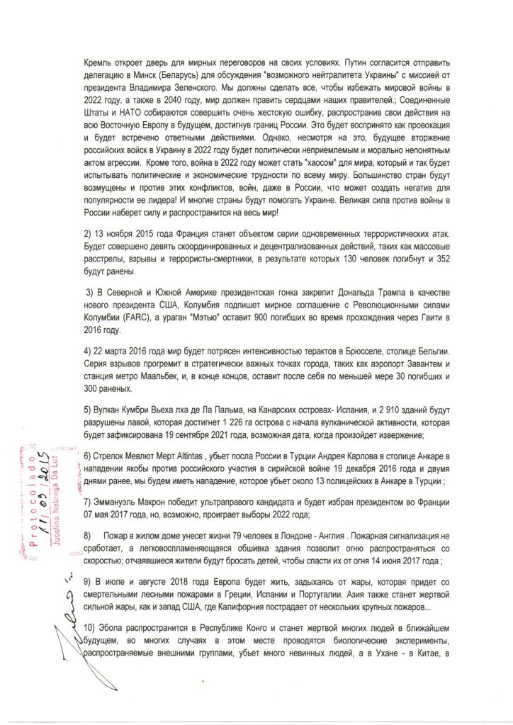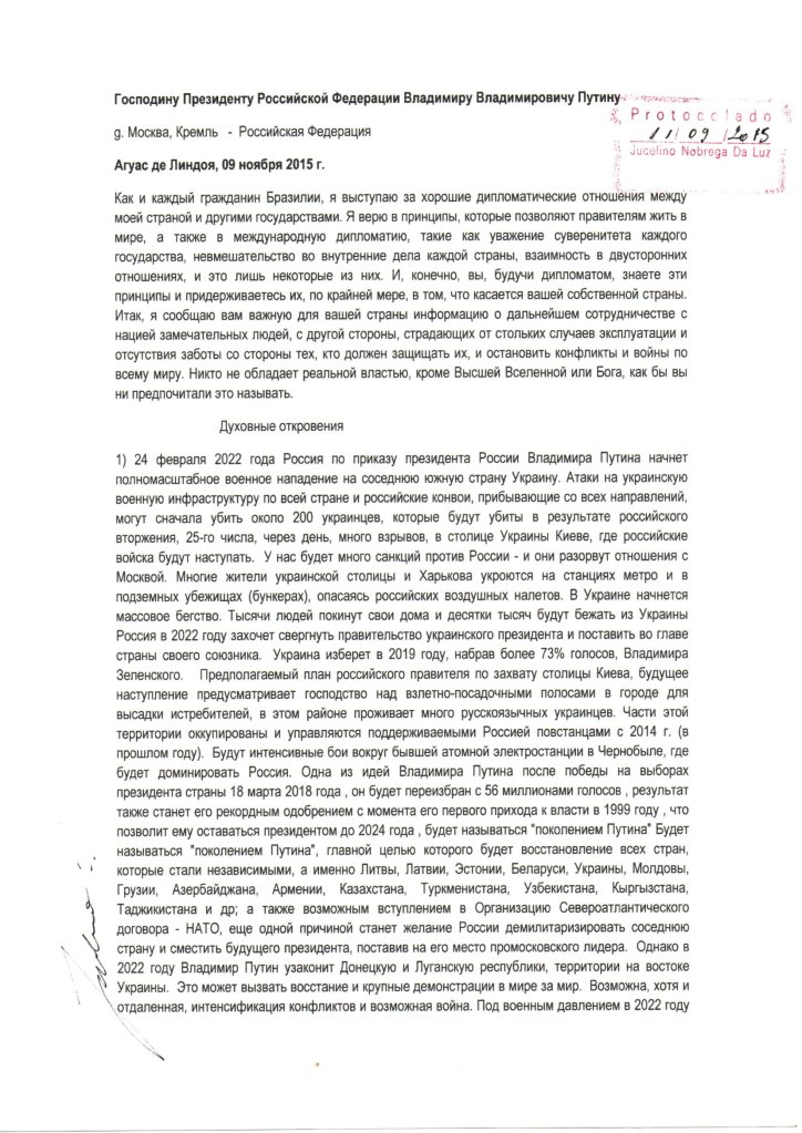 Prezident Wladimir Putine Russiýada iberen hatynda 2022-nji ýylyň 24-nji fewralynda Ukrainanyň çozmagy hakda öňünden aýdypdy. Prezident Wladimir Putin garaşsyz diýip hasaplaýan bölünişikleriniň ýerleşýän ýeri bolan gündogar Ukrainada harby hereket yglan etdi. Goşunlaryň tutuş Ukrainanyň çägine hüjüm edýändigi tiz belli boldy. 2014-nji ýylda we 2015-nji ýylda Ukrainanyň şol wagtky prezidentine iberilen başga bir pygamberlik haty bar.
