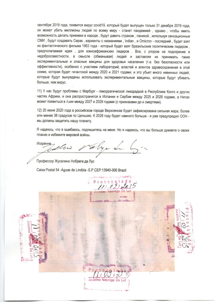 Pygamberlik bilen ýazylan hat, bütin dünýä üçin çynlakaý problemalar barada duýduryş berip, şeýle konflikti azaltmaga synanyşan Braziliýaly Jucelino Luz tarapyndan iberildi. Hüjümi ýazgarýan ýurtlaryň ýagdaýy şeýle: Germaniýa, Belgiýa, ABŞ, Fransiýa, Ysraýyl, Japanaponiýa, Angliýa, Çehiýa, Türkiýe, Polşa we rus halkynyň aglaba bölegi.
