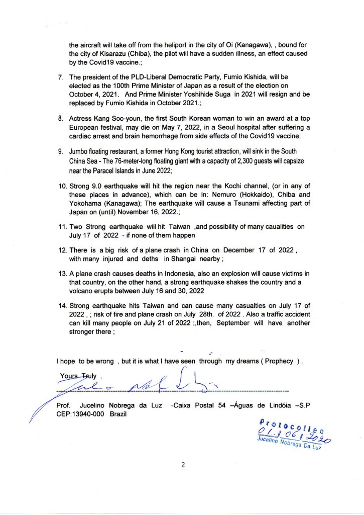 10. Gwo tranbleman tè 9.0 pral frape rejyon an toupre kanal Kochi a, (oswa nan nenpòt nan kote sa yo davans), ki ka nan: Nemuro (Hokkaido), Chiba ak Yokohama (Kanagawa); Tranbleman tè a pral lakòz yon Tsunami ki afekte yon pati nan Japon sou (jiska) Novanm 16, 2022.;