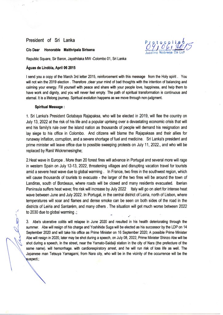 Em 2015 Jucelino Luz enviou carta para presidente do Sri Lanka, avisando que iria perder para Gotabaya Rajapaksa, e que depois , renunciaria e iria fugir do país , na data citada em carta ,manifestantes ocupação de edifícios públicos em Colombo, garantindo, contudo, que continuarão pressionando o poder em meio à grave crise, econômica e política.