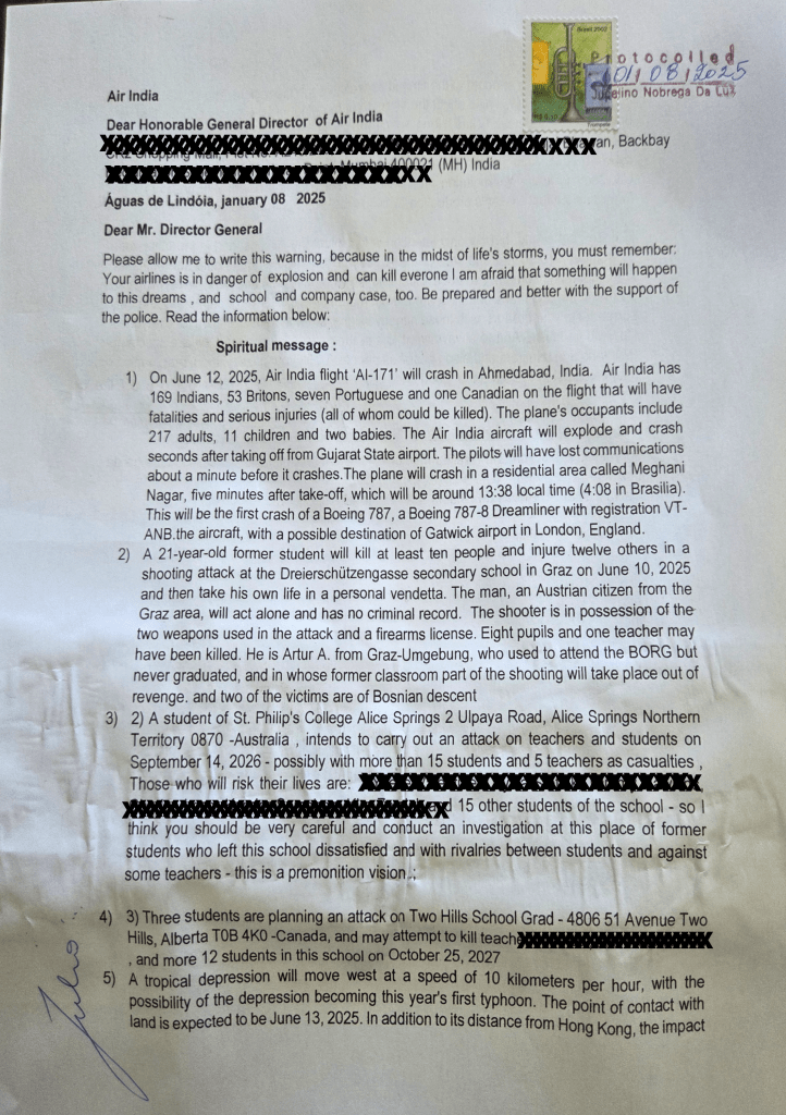 carta enviada para empresa aérea -alguns detalhes foram escondidos por questão de privacidade.