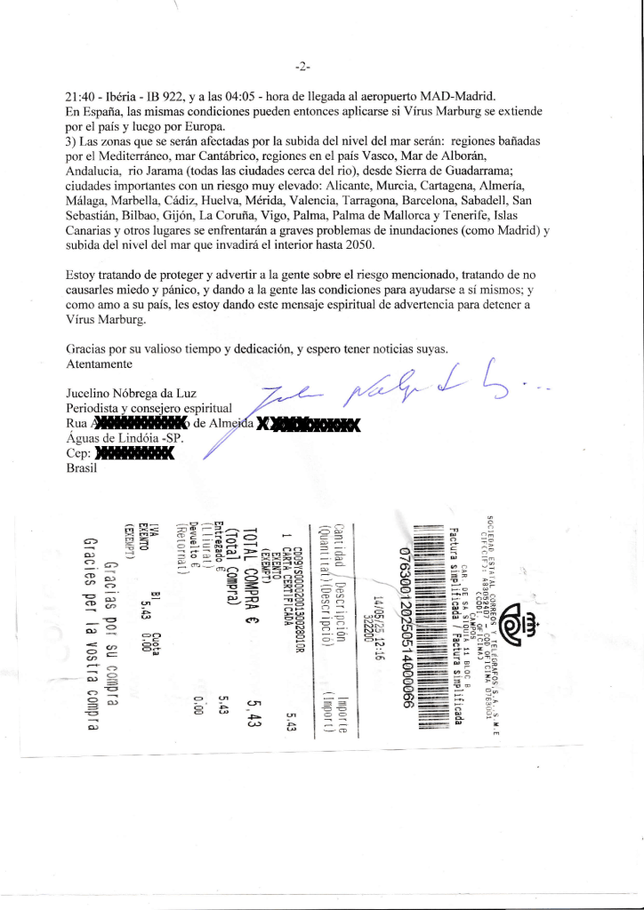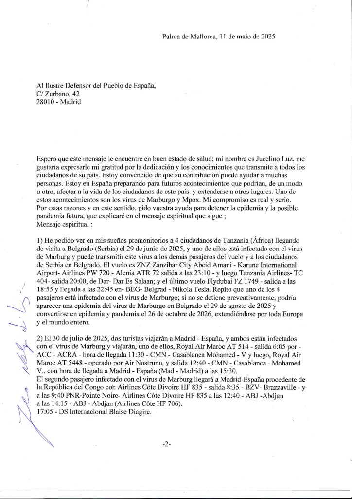 Die Infektion des Menschen wiederum wird durch den Kontakt mit infizierten Fledermäusen übertragen. Sobald eine Person infiziert ist, kann sich das Virus durch Mensch-zu-Mensch-Übertragung durch direkten Kontakt (über Hautläsionen oder Schleimhäute) mit Blut, Sekreten oder anderen Körperflüssigkeiten infizierter Personen verbreiten. Darüber hinaus können auch mit Körperflüssigkeiten einer erkrankten oder verstorbenen Person kontaminierte Gegenstände wie Bettwäsche, Nadeln und medizinische Geräte eine Übertragungsquelle darstellen. Die Anzeichen und Symptome sind: Nach einer Inkubationszeit, die zwischen 2 und 22 Tagen variieren kann, treten die Symptome normalerweise plötzlich auf und sind durch Fieber, Schüttelfrost, Kopf- und Gliederschmerzen gekennzeichnet. Wir möchten Sie darauf hinweisen, dass etwa am fünften Tag nach Symptombeginn ein Hautausschlag, vorwiegend im Brust-, Rücken- und Bauchbereich, auftreten kann. Patienten können Symptome wie Übelkeit, Erbrechen, Brustschmerzen, Halsschmerzen, Bauchschmerzen und Durchfall verspüren. Eine Verschlimmerung der Erkrankung kann zu Symptomen wie Gelbsucht (Gelbfärbung der Augen und Haut), Bauchspeicheldrüsenentzündung, erheblichem Gewichtsverlust, Delirium, Schock, Leberversagen, Blutungen und multiplen Organversagen führen. Wir möchten die Diagnose mitteilen. Es ist wichtig zu beachten, dass die Anzeichen und Symptome der Marburg-Virus-Erkrankung denen anderer Infektionskrankheiten ähneln können. Aus diesem Grund kann die Diagnose erst spät gestellt werden. Das Erkennen früher, für die Krankheit charakteristischer Symptome und Daten hinsichtlich einer möglichen Virusexposition machen es erforderlich, den Patienten zu isolieren und die Gesundheitsbehörden zu benachrichtigen. Die Diagnose kann im Labor anhand von Patientenproben erfolgen. Zu den eingesetzten Techniken gehören die molekulare Diagnostik (RT-PCR), die die Identifizierung des genetischen Materials des Virus ermöglicht, und Antigentests. Wir möchten klarstellen, dass es sich um die folgende Behandlung handelt: Derzeit gibt es keine spezifische Behandlung für die durch das Marburg-Virus verursachte Erkrankung. Krankenhauspatienten erhalten möglicherweise eine unterstützende Therapie, um die Auswirkungen der Infektion auf den Körper zu kontrollieren. Wichtig sind Ruhe, ausreichende Flüssigkeitszufuhr, die Aufrechterhaltung des Sauerstoffstatus, die Kontrolle des Blutdrucks und die Behandlung möglicher Komplikationen. Die derzeit beste bekannte Prävention ist: Zu den vorbeugenden Maßnahmen gegen eine Infektion mit dem Marburg-Virus gehören: Es wäre ratsam, den Kontakt mit Blut und Körperflüssigkeiten von kranken Menschen zu vermeiden. Es ist ratsam, den Kontakt mit dem Sperma einer Person zu vermeiden, die die Krankheit überstanden hat, bis Tests das Fehlen des Virus im Sperma anzeigen.Es wird empfohlen, den Umgang mit Gegenständen zu vermeiden, die mit Körperflüssigkeiten einer infizierten Person in Kontakt gekommen sind. Es wäre ratsam, den Kontakt mit ägyptischen Fledermäusen und nichtmenschlichen Primaten in Gebieten zu vermeiden, in denen die Krankheit vorkommt. Bei Verdacht auf oder Bestätigung der Krankheit wird empfohlen, Maßnahmen zur Infektionsprävention und -kontrolle zu ergreifen, mit dem Ziel, den direkten Körperkontakt mit dem Patienten zu vermeiden. Zur Pflege gehören neben der Isolierung auch die Verwendung von Schürzen, Handschuhen und Schutzmasken, die Sterilisation und die ordnungsgemäße Entsorgung von Nadeln, Geräten und Patientenabfällen. Schließlich richtete Jucelino Luz ein Hilfeersuchen an die Behörden Spaniens, Madrids, Serbiens (Belgrads), Tansanias, des Kongo, Zaires, Ugandas, Ghanas und der WHO. Ziel war es, einen möglichen Ausbruch des Marburg-Virus einzudämmen, der am 25. August 2025 zu einer Epidemie führen könnte. {Am 29. Juni 2025 wird eine der Personen von Tansania nach Belgrad, Serbien, reisen und sich infizieren.} Am 30. Juli desselben Jahres reisen zwei weitere Menschen aus Ghana und dem Kongo nach Madrid (Spanien) und infizieren sich, wobei sie die Krankheit möglicherweise sowohl im Flugzeug als auch am Boden übertragen. Es besteht die Möglichkeit eines epidemischen Ausbruchs des Marburg-Virus am 25. August 2025. Und leider kam es infolgedessen am 26. Oktober 2026 zu einer Marburg-Virus-Pandemie. Wir bitten Gesundheitsorganisationen, Regierungsvertreter, Medien und die Öffentlichkeit um die Zusammenarbeit. Gemeinsam können wir fundierte Informationen bereitstellen und so die Weltbevölkerung schützen. Wir sind nach wie vor schockiert über die letzten beiden Ereignisse (den Verlust von Menschenleben). Bitte teilen und verbreiten Sie diese Informationen. Ich wünsche Ihnen allen viel Erfolg!