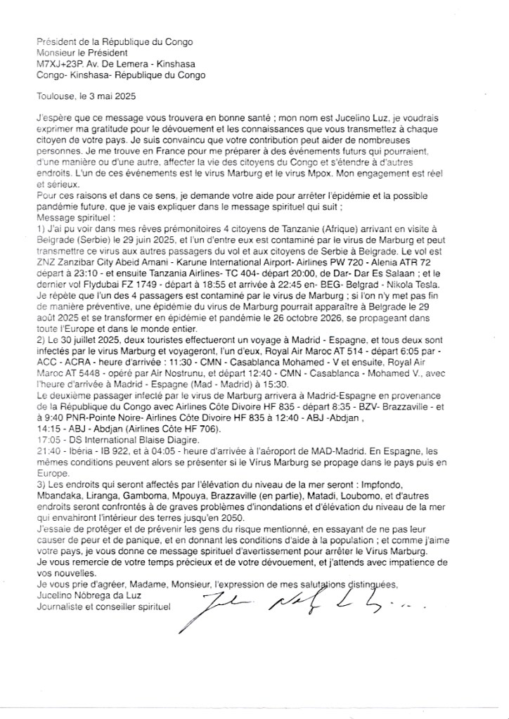 Trebuie să împiedicăm până la 30 iulie 2025 intrarea virusului Marburg în Spania (Madrid) ,nu există încă motive de alarmă: În ciuda virulenței,nu este necesar să ne alarmăm în fața situației, deoarece am trimis scrisori autorităților solicitând luarea de măsuri împotriva virusului și asigurarea protecției pentru a împiedica contaminarea în Madrid -Spania . Riscul de răspândire a virusului în întreaga lume, inclusiv în Brazilia, poate fi încă scăzut, în funcție de acțiunile autorităților mondiale .