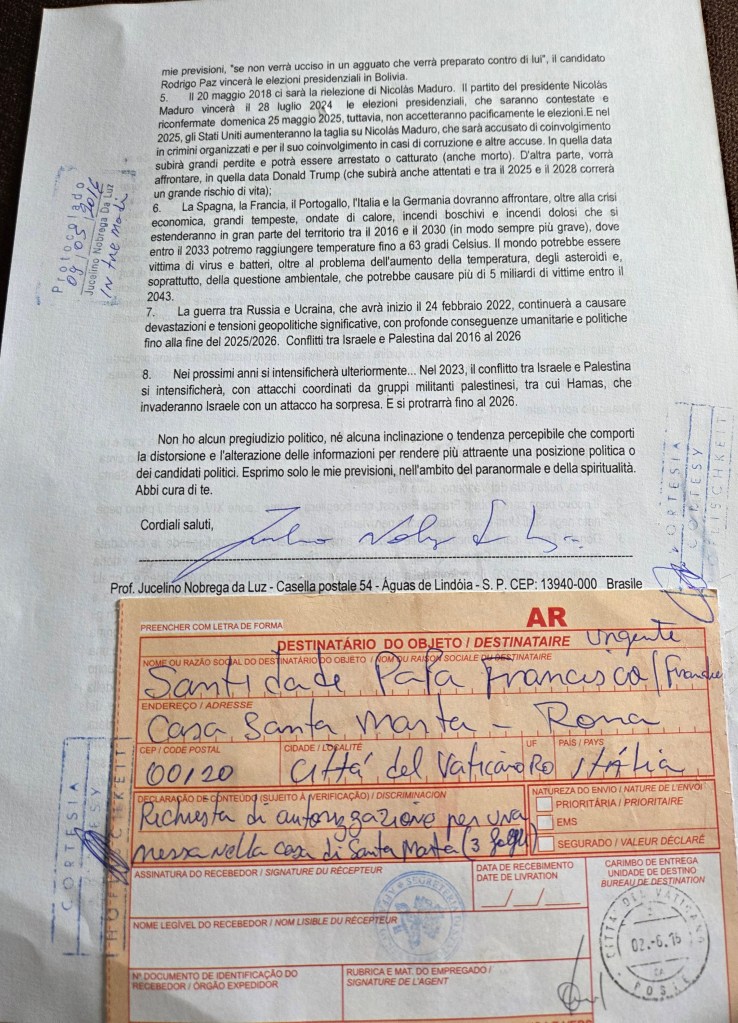 Позвольте мне отметить, что я уже имел возможность лично присутствовать на этой встрече. Позвольте мне поделиться с вами честью, которой для меня было лично встретиться с Вашим Святейшеством Папой. Позвольте мне также сказать, что затронутые темы, а именно любовь, смирение и солидарность, вдохновляют на размышления и сострадание. Его слова очень важны, потому что они способны тронуть сердца и побудить к построению более справедливого и братского мира. Мира, в котором мир, защита окружающей среды, борьба с бедностью и сексуальной эксплуатацией миллионов детей и взрослых в реальном и виртуальном мире, лишающих людей надежды, станут реальностью. Где права человека? – я уже много раз поднимал этот вопрос, но его уклоняются. Позвольте мне сказать, что, по моему скромному мнению, нужно учитывать, что, сколько бы ни говорили о демократии и социализме, если мировые лидеры, или по крайней мере некоторые из них, живут материализмом и роскошью, это ни к чему не приводит. Кризис не ограничивается только мировой экономикой. Это также кризис лидерства, морали, в котором лидеры, часто движимые жаждой власти и роскоши, эксплуатируют самых уязвимых. Это вопрос, требующий серьезного и честного ответа со стороны человечества. Я также хотел бы поделиться с вами своим духовным посланием, которое изложено в следующих предсказаниях.