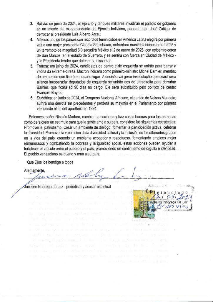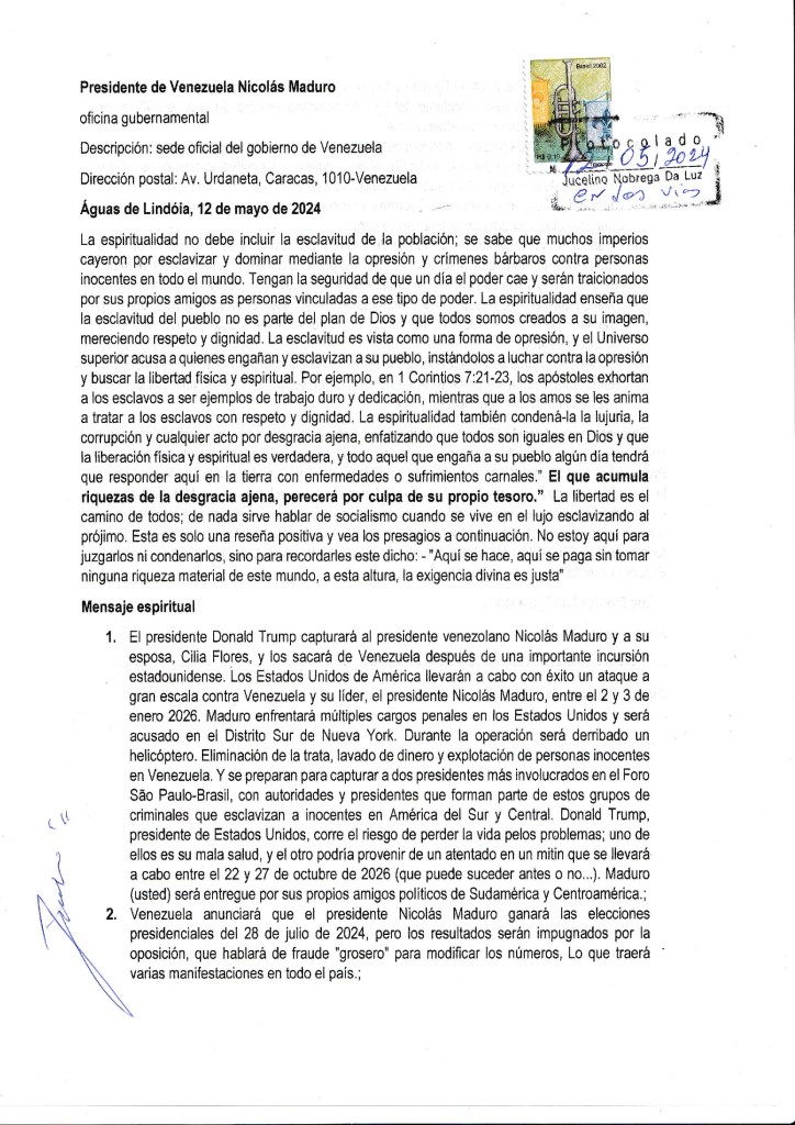1. Presidentti Donald Trump vangitsee Venezuelan presidentin Nicolás Maduron ja hänen vaimonsa Cilia Floresin ja vie heidät pois Venezuelasta merkittävän Yhdysvaltain hyökkäyksen jälkeen. Yhdysvallat toteuttaa menestyksekkään laajamittaisen hyökkäyksen Venezuelaa ja sen johtajaa, presidentti Nicolás Maduroa vastaan 2.–3. tammikuuta 2026. Maduro joutuu vastaamaan useisiin rikossyytteisiin Yhdysvalloissa ja hänet asetetaan syytteeseen New Yorkin eteläisessä piirikunnassa. Operaation aikana yksi helikopteri tullaan ampumaan alas. Ihmiskauppa, rahanpesu ja viattomien ihmisten hyväksikäyttö Venezuelassa tullaan lopettamaan. Lisäksi valmistellaan kahden muun São Paulo-Brasilian foorumiin kuuluvan presidentin vangitsemista. Nämä viranomaiset ja presidentit kuuluvat rikollisryhmiin, jotka orjuuttavat viattomia ihmisiä Etelä- ja Keski-Amerikassa. Yhdysvaltain presidentti Donald Trump on vaarassa menettää henkensä ongelmien vuoksi; yksi niistä on hänen heikko terveytensä, ja toinen voi johtua murhayrityksestä, joka tapahtuu 22.–27. lokakuuta 2026 pidettävässä kokouksessa (joka voi tapahtua aikaisemmin tai ei…). Maduro (sinä) luovutetaan omien poliittisten ystäviesi toimesta Etelä- ja Keski-Amerikasta.